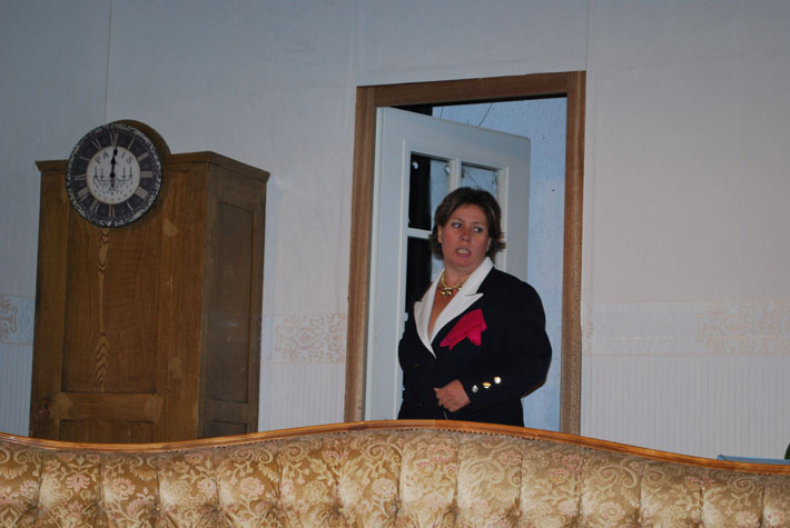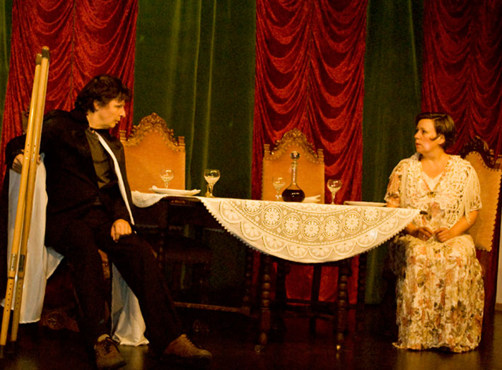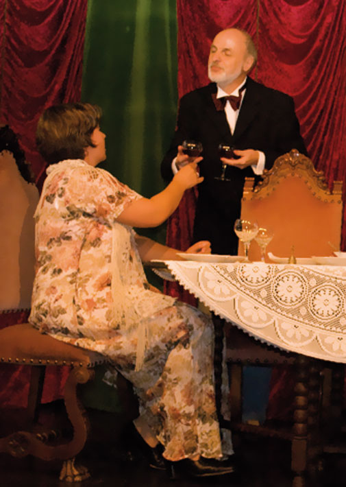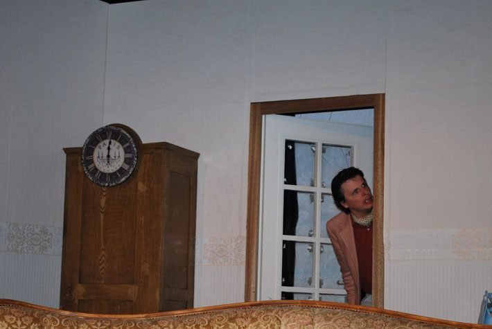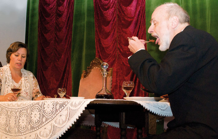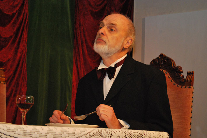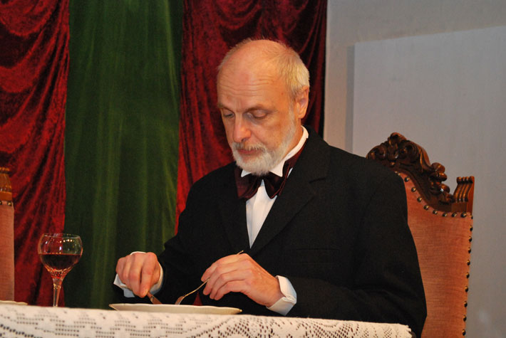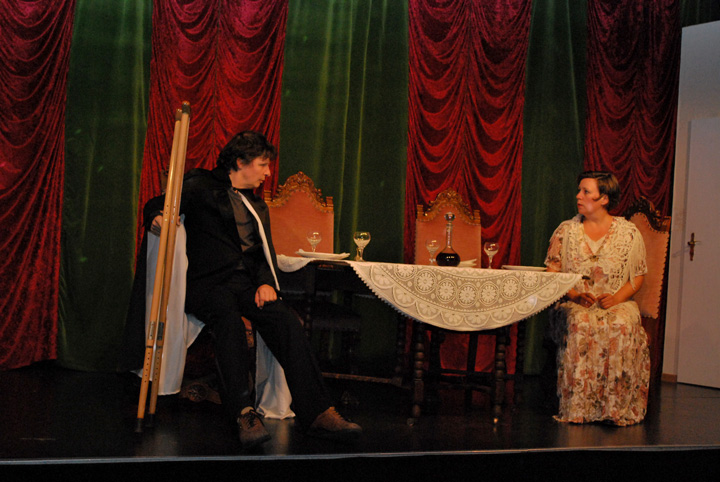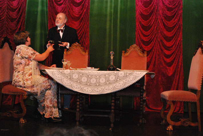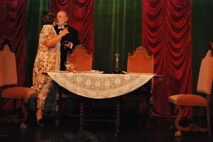 Der Abendgast taucht auf und macht sie durch seine Geschichten noch konfu-ser. Als endlich ihr Gatte erscheint, liegen Mord und Totschlag in der Luft. Das Abendessen verläuft dann auch anders als geplant.