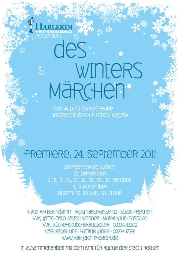 Erleben auch Sie auch einen romantischen Abend, bei dem sie weinen und lachen können, bei dem sie mit dem Liebespaar zittern und mit dem König sich über sein wiedergefundenes Glück freuen können oder einfach nur der Poesie der Worte folgen. Tragödie, Komödie oder Märchen – urteilen Sie selbst. Wir laden herzlich dazu ein.