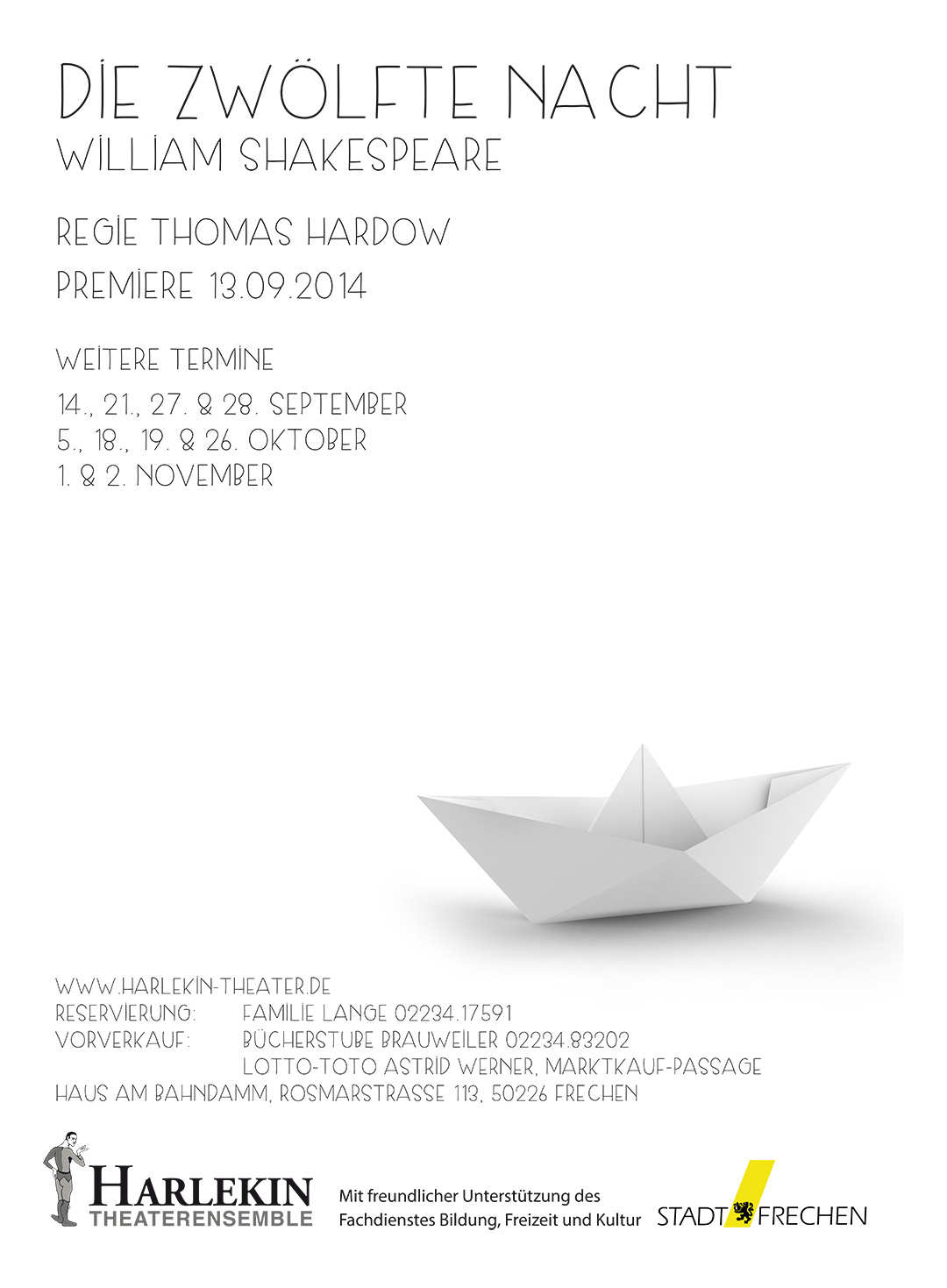 Shakespeares letzte wirkliche Komödie, 1601 oder 1602 entstanden – im Deutschen besser unter dem Titel „Was Ihr wollt“ bekannt – gilt als eines der beliebtesten und meistgespielten Stücke des „Schwan vom Avon“. In ihr dokumentiert er zum letzten Mal sein Gespür für Situationskomik und verbindet Ernstes und Heiteres zu einer perfekten und unwiderstehlichen Einheit, die auch heute noch fasziniert. Dafür fährt er sämtliche Zutaten seiner bis dato geschriebenen unterhaltsamen Stücke auf. Da sind die Zwillinge aus der „Komödie der Irrungen“, der trinkfeste Ritter aus „Heinrich IV“, die als Mann verkleidete Frau aus „Wie es euch gefälltt“ etc. Da gibt es Fechtduelle, Intrigen, Schiffbrüche, schwärmende Liebhaber, Liebesbriefe, Sockenhalter und gelbe Strümpfe. – Kurz und gut: Hier bedient er genau die Wünsche seines Publikums, indem er diesem gibt WAS es WILL.