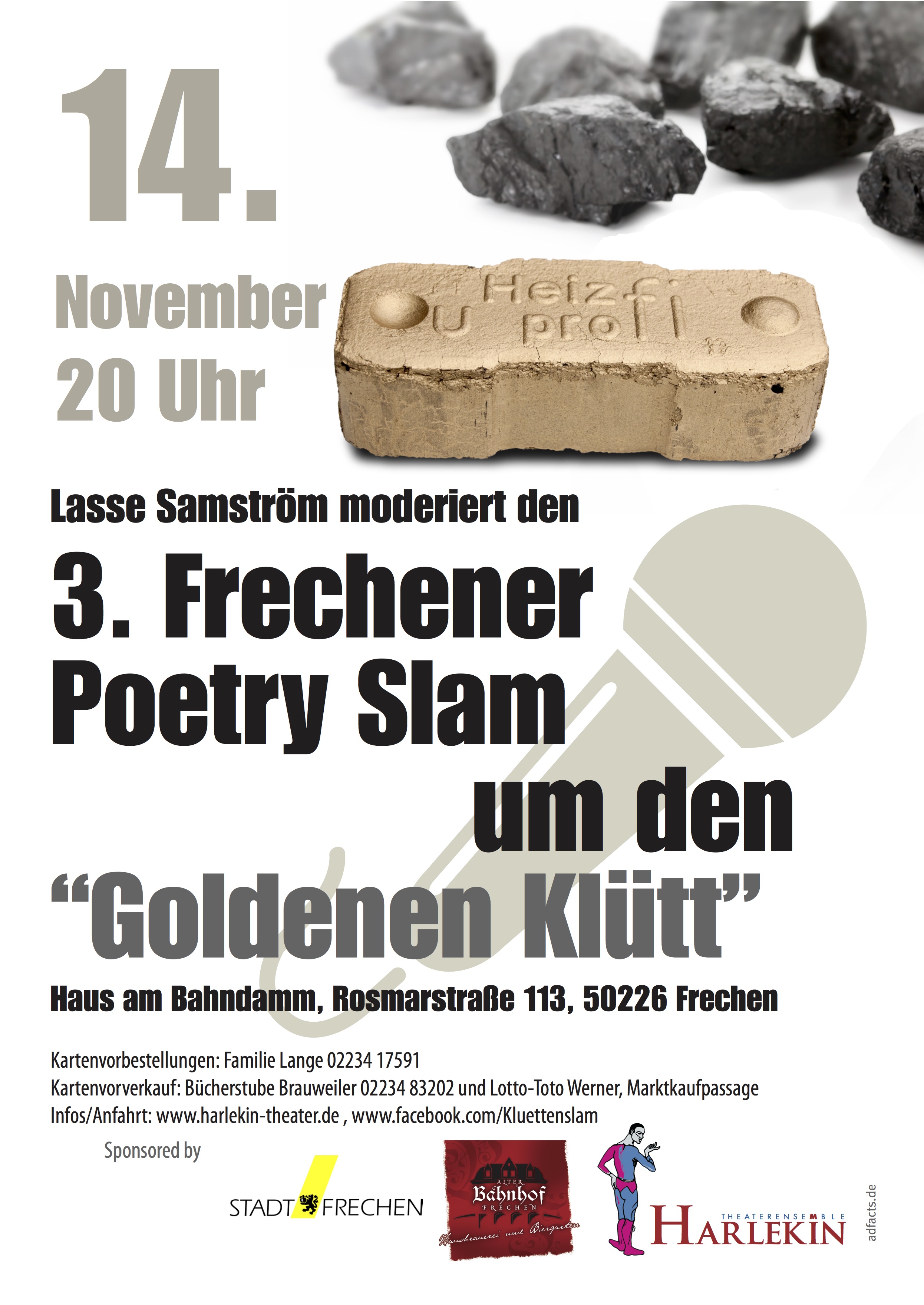 Nun treten zum dritten Mal in Frechen acht Autorinnen und Autoren gegeneinander an. Sie stellen sich dem Urteil einer Jury, die zu Beginn des Abends aus dem Publikum erwählt wird. „Poetry Slams“ nennen sich diese Dichterwettkämpfe, die in der deutschen Kulturlandschaft längst ihren Platz gefunden haben. Ob Alltagssatire oder Schüttelreime – die Texte der Slam-Poeten sind für den Vortrag geschrieben. Das macht sie so lebendig.