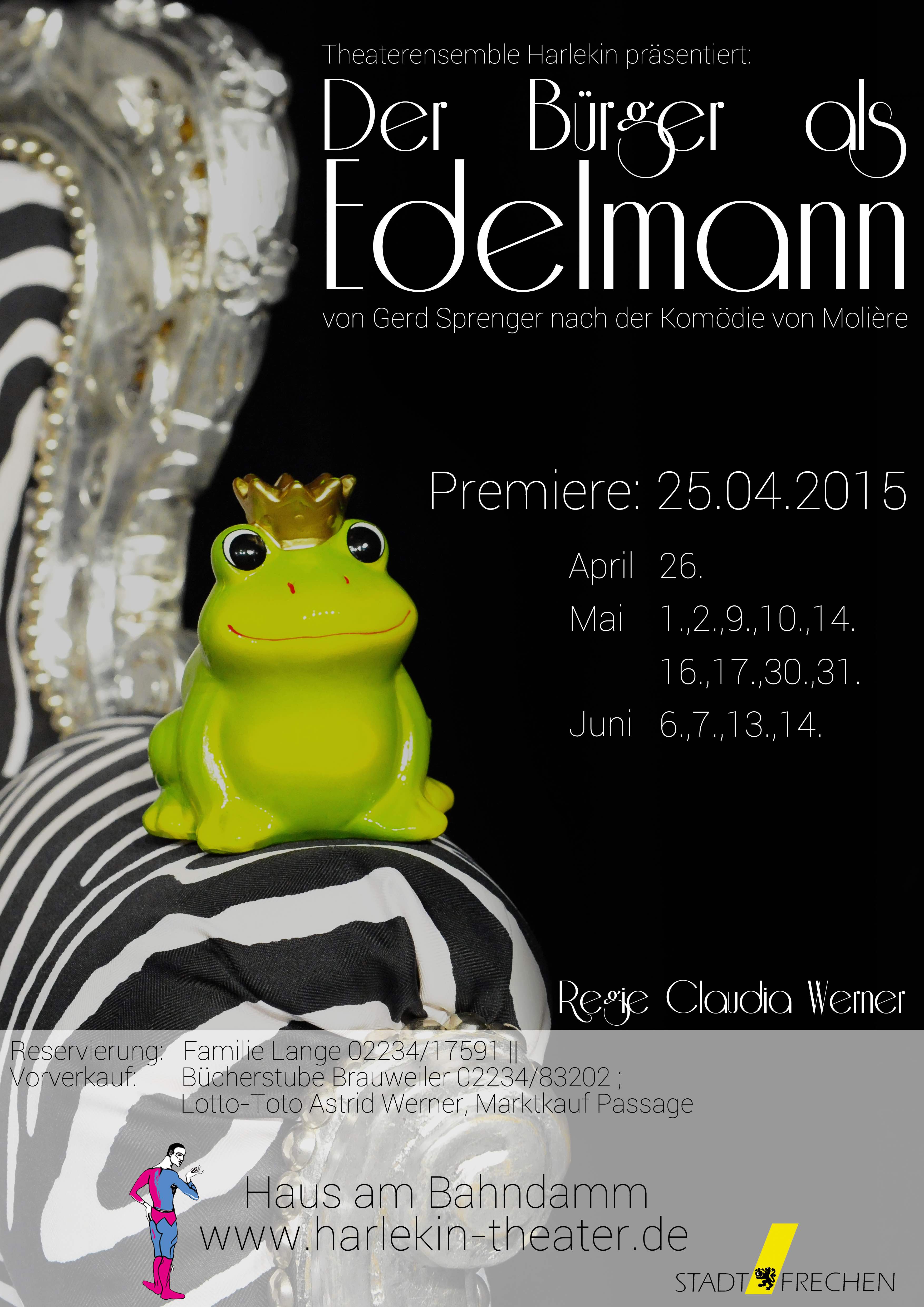 „Bourgeois gentilhomme“ wurde 1670 in Chambord als Ballettkomödie uraufgeführt. Im Auftrag des französischen Königs Ludwig XIV., der selber gerne tanzte und mit der Parodie einer türkischen Zeremonie einen Gesandten an seinem Hof verspotten wollte, schrieb Molière den Text zur Musik des Komponisten Lully. Gerd Sprenger hat Molières Ballettkomödie „Der Bürger als Edelmann“ neu übersetzt, um zeittypische Allegorien und Längen gekürzt und die sprachlichen Spitzfindigkeiten des 17. Jahrhunderts in neuzeitliche Wortspielereien übertragen. Mit viel Musik gerät auch unser moderner Bürger in ein aberwitziges, ba-rockiges Spektakel.